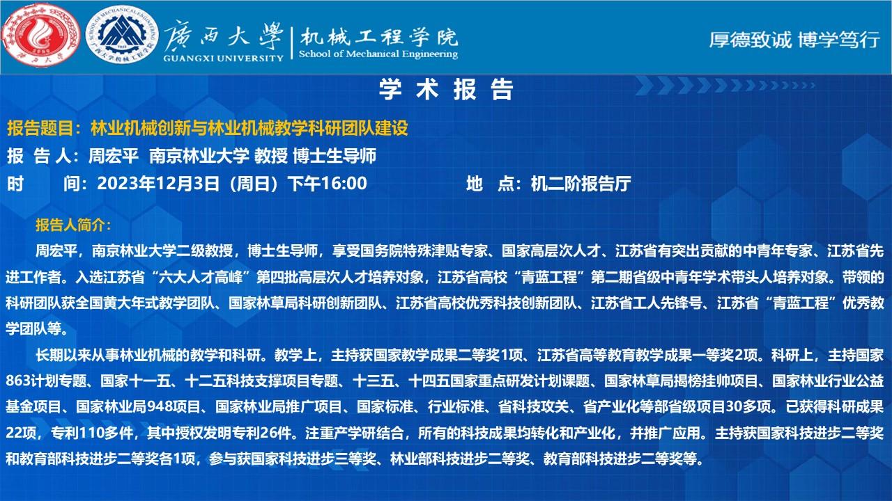 【william威廉中文官网学术报告】林业机械创新与林业机械教学科研团队建设
