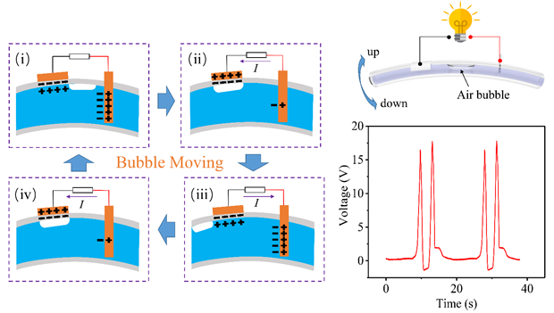近日,公司助理教授李昌铮团队开发了一种基于液体中移动气泡的新型摩擦纳米发电机(B-TENG),当体积仅有1.08 cm3的小气泡在充水聚四氟乙烯(PTFE)管中缓慢移动时,可以产生高达17.5 V的开路电压,其经过600次工作循环后依旧表现出持续稳定的输出特性。此次工作对B-TENG的摩擦发电机理及电荷转移机制、装置的负载特性及影响因素进行了系统的研究。研究成果以“Triboelectric nanogenerator based on a moving bubble in liquid for mechanical energy harvesting and water level monitoring”为题发表在国际著名期刊《Nano Energy》上,公司为第一单位及通讯单位,李昌铮助理教授为第一作者和通讯作者,2019级硕士研究生刘绪阳等完成主要工作。