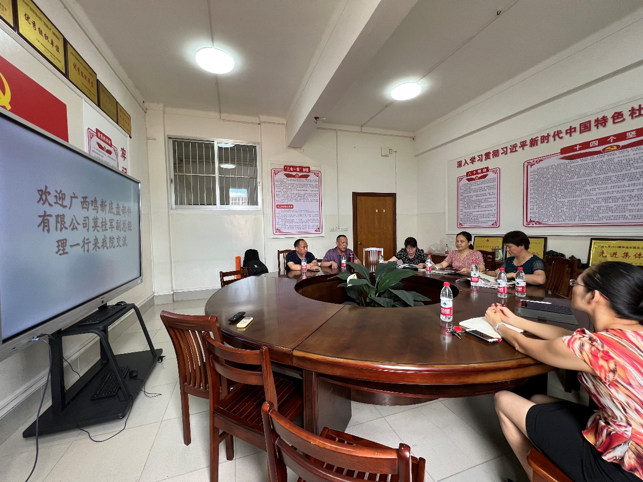 2022年7月8日上午,桂林鸣新底盘有限公司莫桂军副总经理以及综合管理部马超群部长一行,到公司进行产学研交流。公司常务副经理蒙艳玫、党委副书记黄路明、副经理李俚,以及车辆工程系主任覃频频等相关老师参加了座谈会。