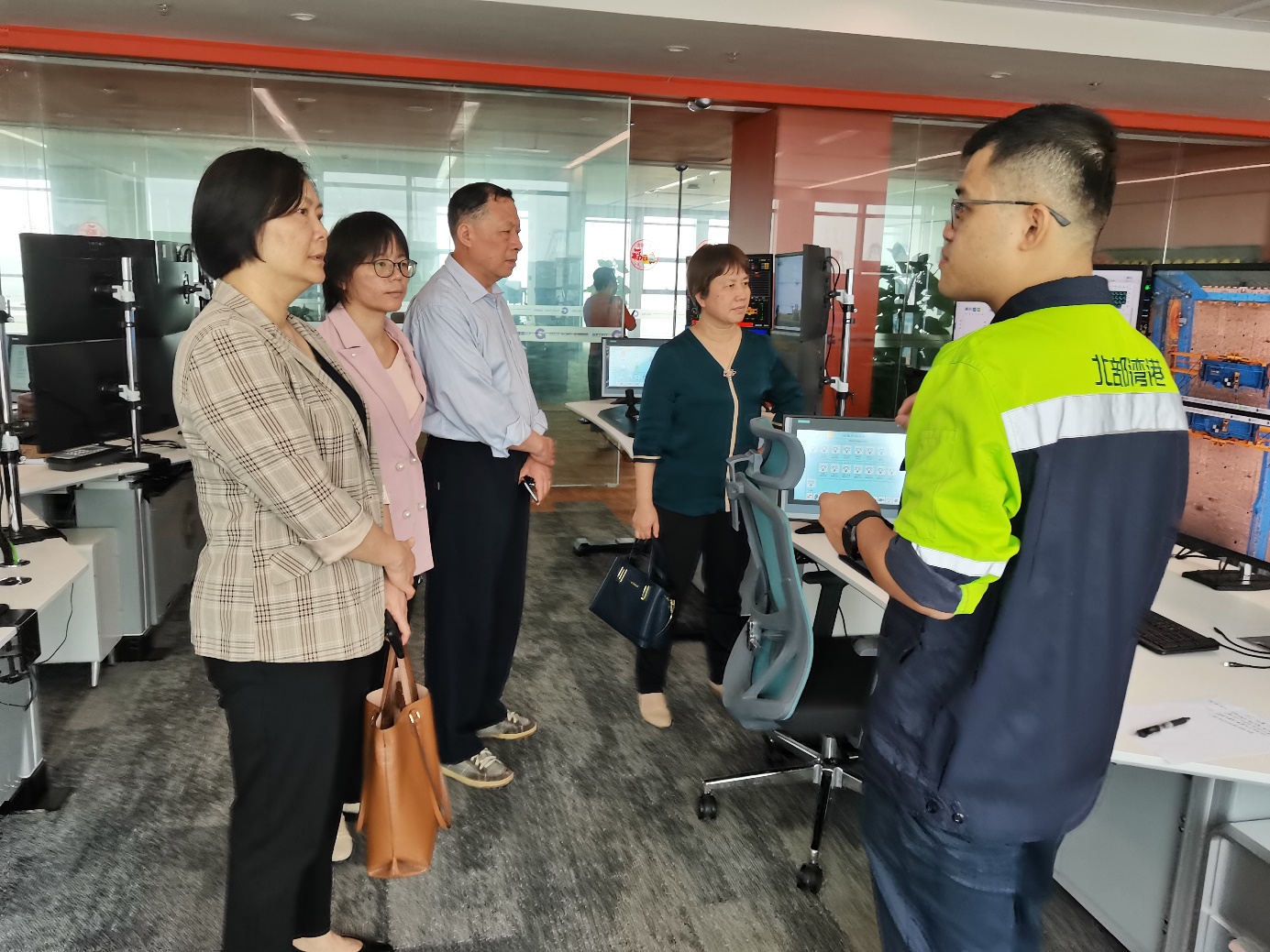 卢婵江书记一行在盛港码头公司总经理助理兼综合部经理宋炜嘉的引导下,先后参观了盛港码头公司智慧创新中心和智慧运营中心,详细了解工作环境、企业文化、人才需求、发展规划等情况,为2023届毕业生“访企拓岗”,为专业教学实习实践等进行现场考察。