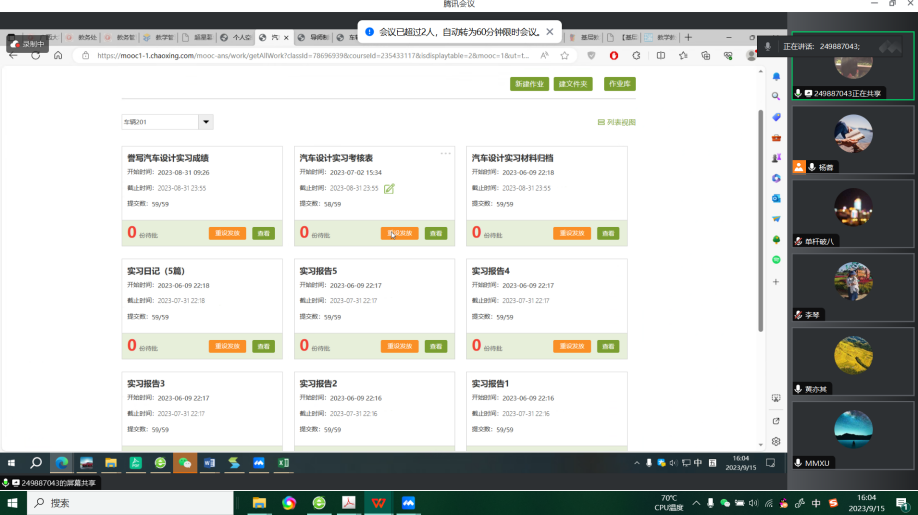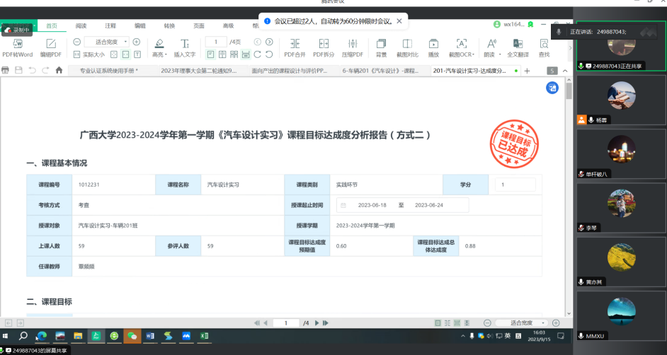 覃频频副教授先与系里黄亦其副教授、陆静平副教授、黄俊明老师、李琴老师等进行了大纲修订、课程达成度分析和存档材料的经验分享和交流。而后,覃老师又分享了关于专业实习、导师制和车辆工程专业实验等课程的建设经验,并协调安排了新进教师跟进对接相关课程,实现课程建设“老带新、传帮带”。