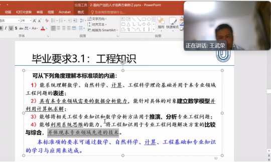 为更好的凝练工程教育专业认证申请材料,2024年10月17日晚,公司邀请上海大学王武荣教授公司机械设计制造及其自动化、机械电子工程、车辆工程和能源与动力工程等4个专业在整理申请材料时提出的共性问题进行辅导答疑。辅导会议通过腾讯会议召开,历时3个多小时。公司副经理李俚、机械工程系主任邓建新、机械电子工程系主任李欣欣,车辆系主任李岩舟、能源与动力系主任欧阳天成以及各专业系副主任和9门核心课的骨干教师等23人参加辅导会。