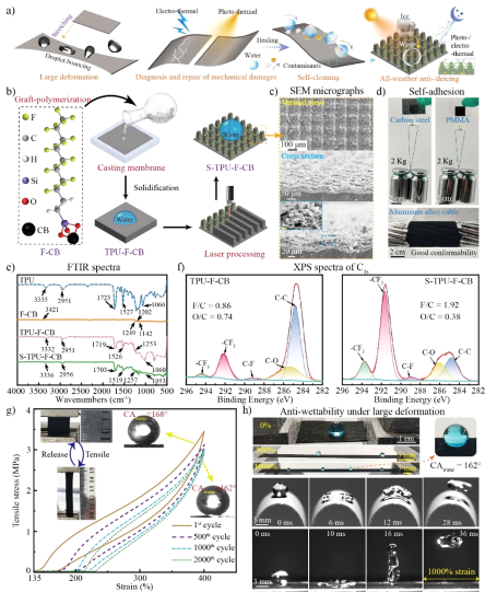 在极端气候条件下,冰雪积聚对电力传输工作站、风力涡轮机叶片等关键设施造成严重力学失稳影响。传统的防、除冰方法存在诸多限制,而超疏水表面因其延迟结冰时间和降低冰粘附强度的特性而备受关注。针对上述问题,研发集超疏水、大变形、裂纹诊断和愈合以及全天候防/脱冰等功能于一身的膜基材料(S-TPU-F-CB)。对于实际应用中的复杂结构表面或大变形场合下的防冰需求具有重要意义。