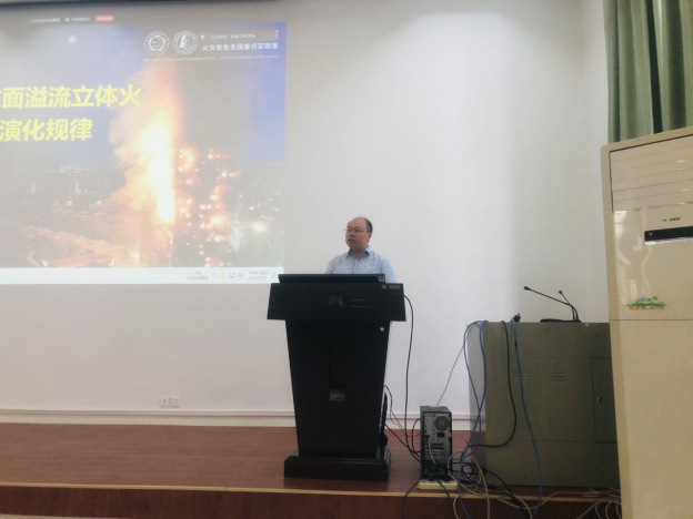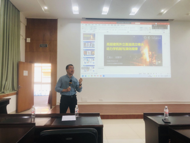 高层建筑外立面立体火灾是城市火灾与公共安全的重要挑战。胡教授从室内火灾行为、外立面火溢流临界理论、火溢流特征参数演化和城市大尺度高层建筑立体火等四个层面,对环境风作用下高层建筑火灾燃烧行为进行了系统介绍,为师生讲解了环境风、低压、不同外墙结构等边界条件下的开口火溢流及外立面立体火行为,揭示了外立面火溢流发生机制、火焰高度、温度、热流分布等参数的数理模型及城市大尺度灾害演化机理。