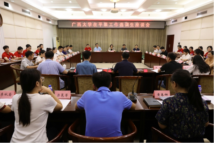 校学工部副部长王利军,员工办副主任黄庶冰,公司党委书记卢婵江、副书记黄路明、副经理黄豪中、莫帅、陈宏波、全国党建样板支部书记邓建新等30多名师生党员参加活动。平果市委常委、组织部部长黄瑞华、副部长张飞,那坡县委常委、组织部部长梁安忠、副部长黄波、妇联主席蓝靖月,以及公司在平果市和那坡县工作的十多名选调生代表出席座谈会。