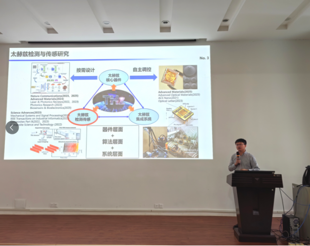 张留洋教授以《太赫兹检测与传感研究》为题,结合自身最新研究成果,深入剖析太赫兹检测与传感领域的前沿动态,基于太赫兹时域信号的局部对称性特征,结合脉冲信号的多次反射机制,提出一套在极低信噪比下进行高对比度成像的太赫兹信号处理体系。该体系能够对涂层、复合材料和电子器件的内部缺陷实现高效精确定位与检测,对机械领域关键构件的损伤检测具有较为显著的应用价值。