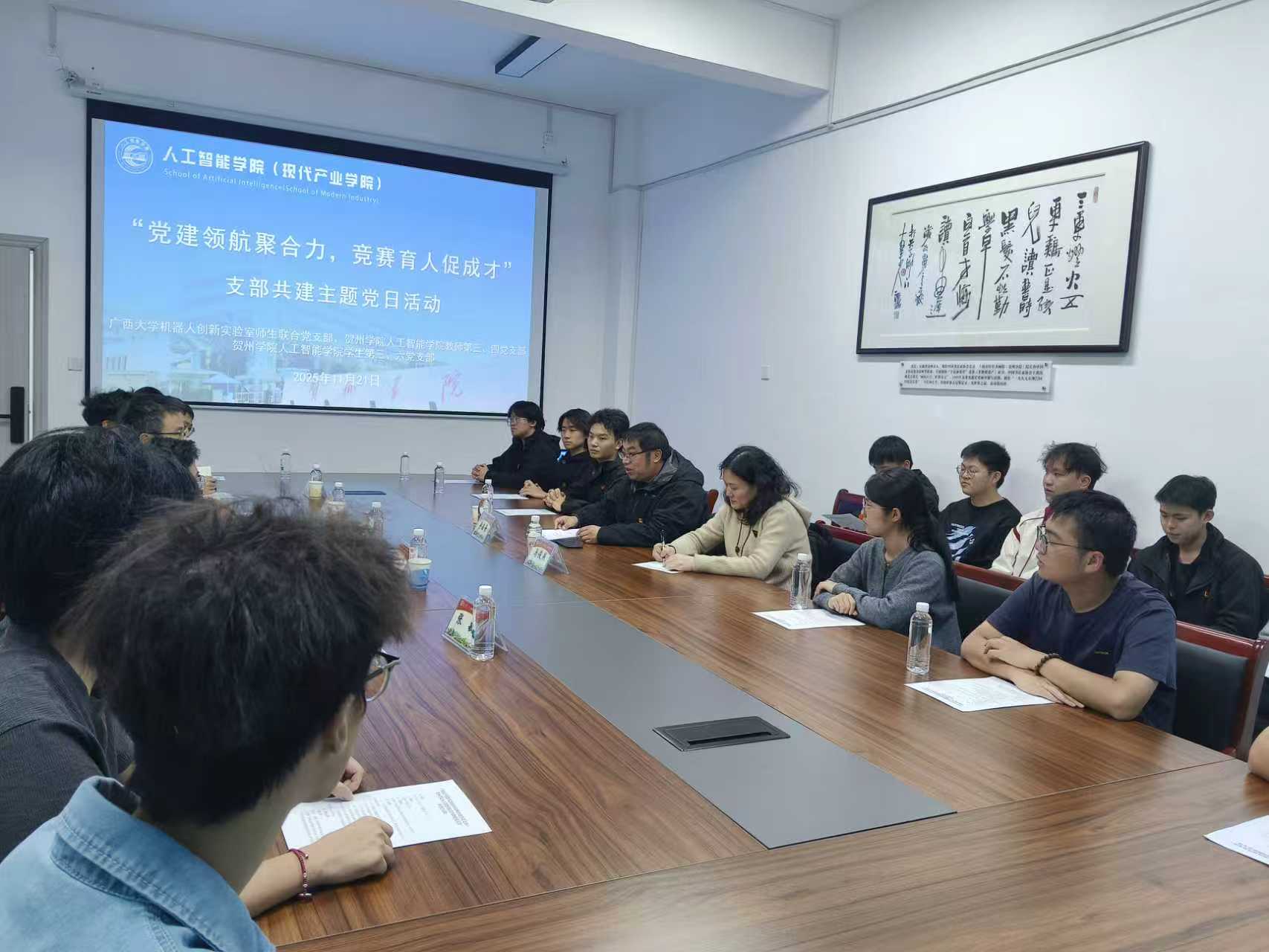 2025年11月21日下午,公司党委新成立的william威廉中文官网机器人创新实验室师生联合党支部在支部书记李岩舟老师的带领下,赴贺州公司与贺州公司人工智能公司教师第四党支部开展“党建引领实践育人,智能助力教育强国”联合主题党日活动。贺州公司人工智能公司(现代产业公司)党委书记李素云、党委副书记兼纪委书记邓玉赏、智能工程系主任罗士君以及两个支部的全体党员参加联建。