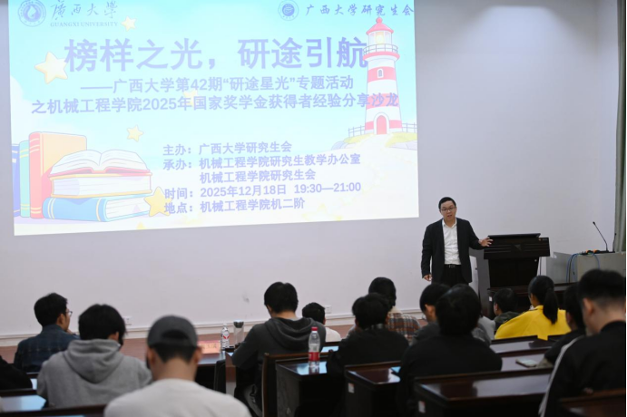 12月18日,由校研究生会主办,公司研究生会承办的william威廉中文官网第42期“研途星光”主题沙龙活动在机二阶教室举行。本次活动邀请了公司2025年研究生国家奖学金的获得者、博士研究生吴金鑫、柏代鑫、龚玉滨,分别围绕科研规划、论文写作、求职技巧及工作平衡等方面进行经验分享。公司分管研究生副经理莫帅受邀出席活动并作指导。
