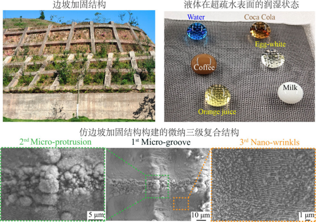 近日,公司微纳机电系统研究团队在耐久超疏水微纳复合结构的构建机制中取得重要进展。该研究受山体边坡加固结构的启发,采用飞秒激光光束整形原理,在金属网丝表面构建了微米尺度沟槽,亚微米尺度凸起与纳米尺度褶皱的三级微纳复合结构,研究中阐明了结构在多载荷工况下的微观形貌演化规律以及结构损伤机制,并极大地提升了超疏水表面的机械耐久性,对于应用在严苛工况下的超疏水表面而言意义重大。相关研究成果近期以题为“One-Step Fabrication of Robust Liquid-Repellent Mesh Induced by Femtosecond Laser(飞秒激光一步制备耐久超拒液膜基材料)”发表在影响因子16.744的国际权威期刊“Chemical Engineering Journal” (https://authors-elsevier-com-s.vpn.gxu.edu.cn:8118/a/1hDnW4x7R2gNks)。