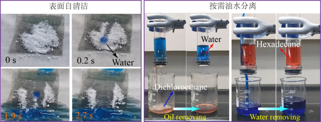 荷叶表面与水滴接触时在固-液之间形成“气垫”,使水滴极易滚落,出现 “自清洁”现象,为荷叶赢得出淤泥而不染的赞誉。近年来,通过仿生制造,开发出各式各样具有“荷叶效应”的超疏水材料,作为自清洁和油水分离的利器,已在工业、军事、日常生活中大显身手。遗憾的是,这些超疏水材料存在一个共性问题--表面微结构强度差,极大制约了其广泛应用。然而,微纳米结构是制备超疏水表面的关键,现有的超疏水材料在冲击载荷或机械摩擦作用下,表面微纳结构坍塌,低表面物质损耗,暴露底层材料,而出现亲水位点,固-液间粘附力陡增,导致超疏水性能降低或消失,进而失去自清洁效应,降低油水分离效率。