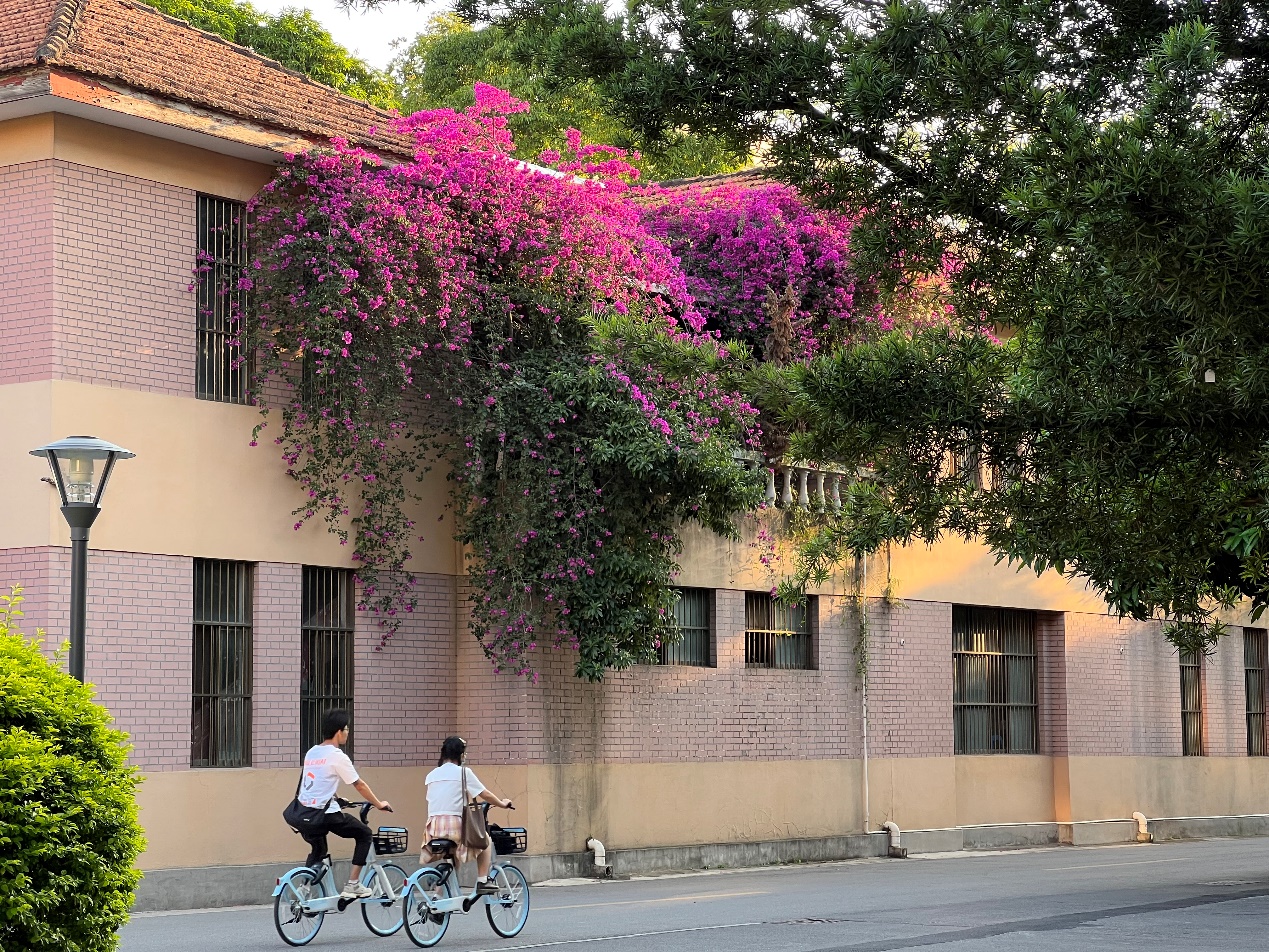 作品介绍:拍摄于2022年5月3日下午约18点20,开车路过机械公司的红楼,红楼二楼的三角梅正盛,夕阳下三两路过的员工,相得益彰。